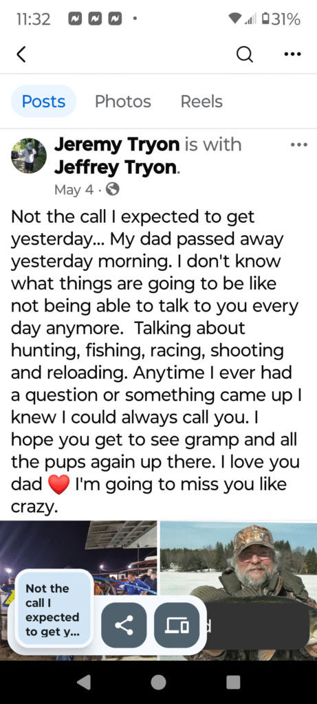 Because we are unable to find a published obituary we’ve published the following Facebook screenshot post by Jeffrey’s son, Jeremy.